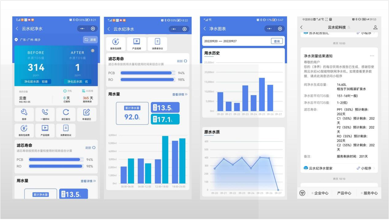 而云水纪4G智能物联网净水机,通过智能物联网系统为用户实时监测水质、监测水量、监测滤芯剩余寿命状态,提供一键呼叫、一键报修、一键服务续费、滤芯失效自动断水等智能交互体验。并且通过为用户提供“一机一管家,一天一报告”的终身陪护式服务,培养用户的使用习惯,打造牢不可破的使用粘性,确保用户喝到的每一滴水都是高品质好水的同时让用户清清楚楚的感知到净水的价值,保正换芯率。在云水纪前期市场装机的数据模型验证下,云水纪的4G智能物联净水机换芯率高达92%。